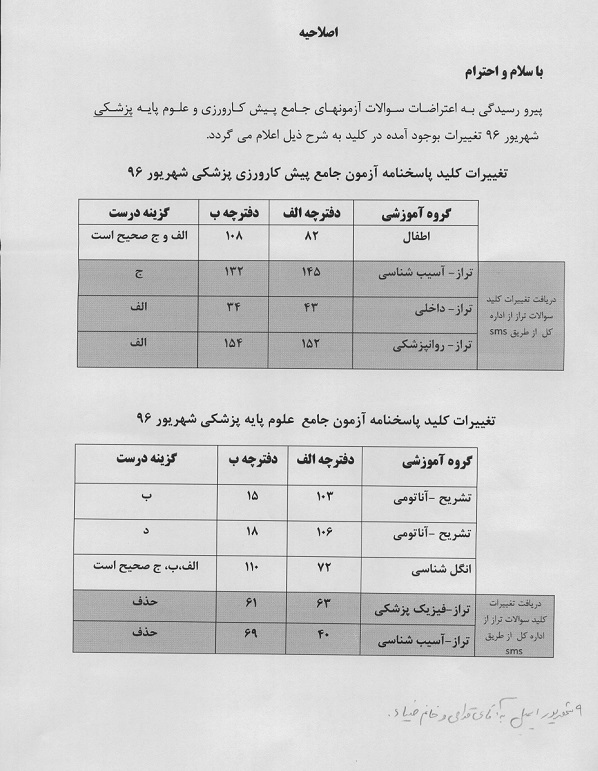 پیرو رسیدگی به اعتراضات سوالات آزمونهای جامع پیش کارورزی و علوم پایه شهریور ماه 96 تغییرات بوجود آمده در کلید به شرح ذیل می باشد.