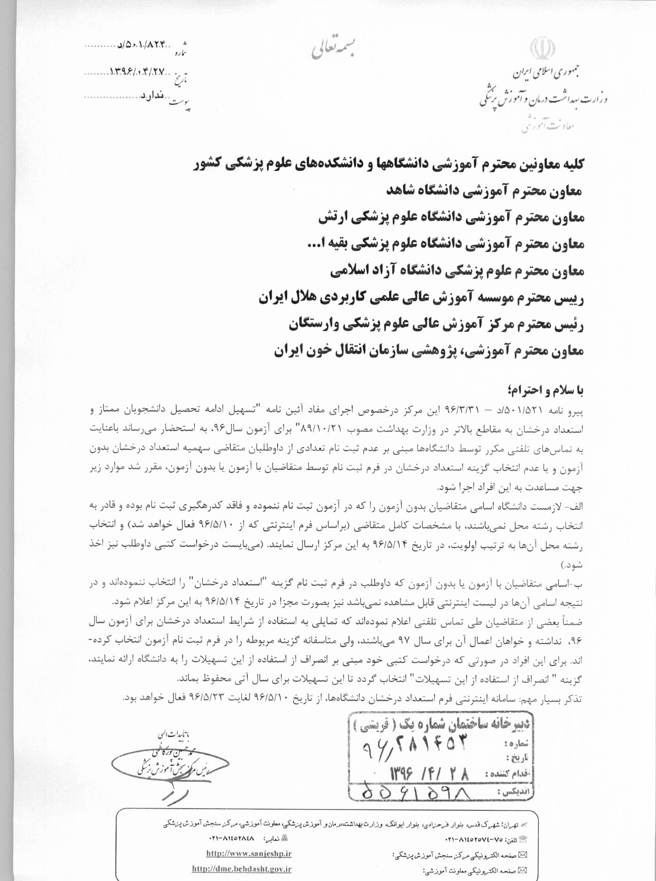 دانشجویان جهت ارائه درخواست کتبی و ویرایش وتکمیل اطلاعات تا تاریخ 05/05/96 به واحد استعدادهای درخشان واقع در ساختمان قریشی (طبقه دوم) مراجعه فرمایند.