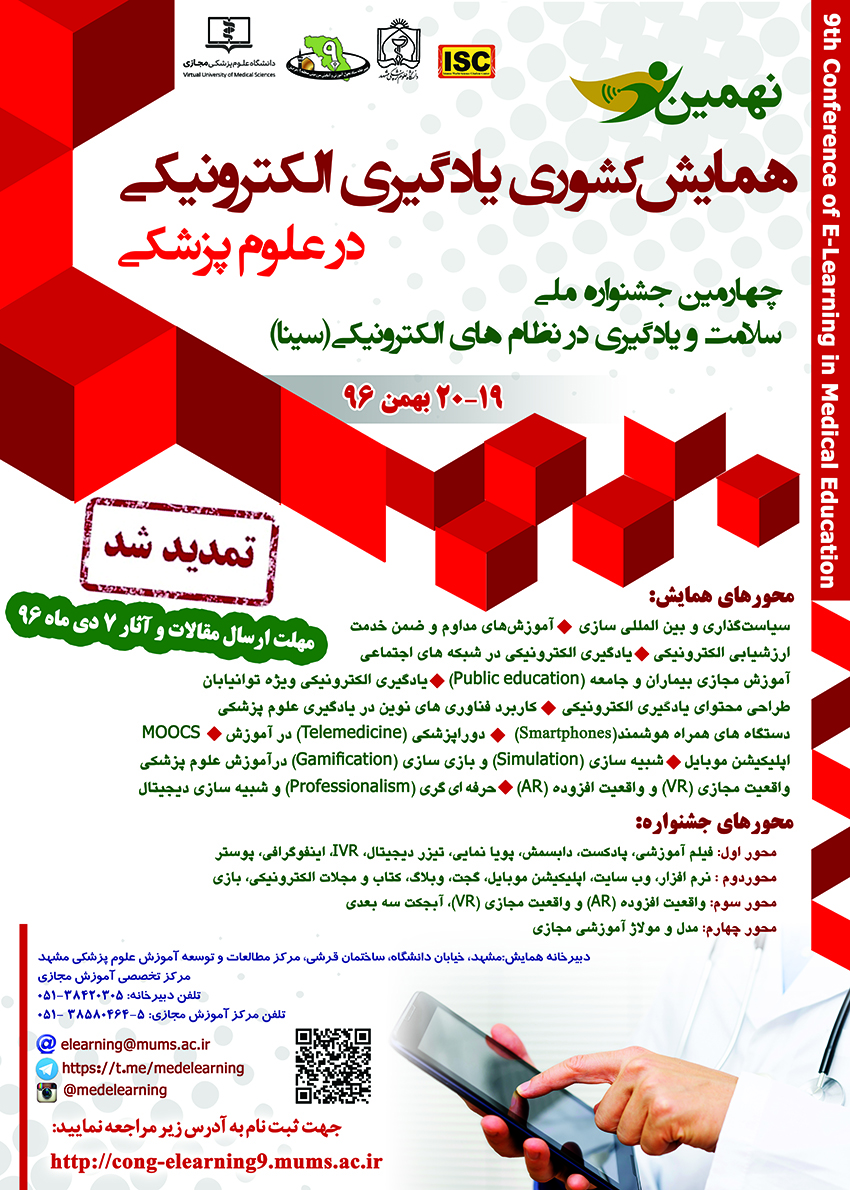 وی افزود: همایش یادگیری الکترونیکی در علوم پزشکی در محورهای سیاستگذاری و بین المللی سازی، آموزشهای مداوم و ضمن خدمت ،ارزشیابی الکترونیکی،یادگیری الکترونیکی در شبکه های اجتماعی ،آموزش مجازی بیماران و جامعه (Public education) ،یادگیری الکترونیکی ویژه توانیابان ،طراحی محتوای یادگیری الکترونیکی ،کاربرد فناوری های نوین در یادگیری علوم پزشکی ،دستگاه های همراه هوشمند(Smartphones)،دوراپزشکی (Telemedicine) در آموزش، اپلیکیشن موبایل،شبیه سازی (Simulation) و بازی سازی (Gamification) درآموزش علوم پزشکی ،واقعیت مجازی (VR) و واقعیت افزوده (AR) و حرفه ای گری (Professionalism) و شبیه سازی دیجیتال برگزار می شود.