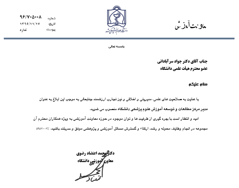 باحکم دکتر اعتضاد رضوی ، معاون آموزشی دانشگاه دکتر جواد سرآبادانی عضو هیات علمی دانشکده دندان پزشکی به عنوان مدیر مرکز مطالعات و توسعه آموزش علوم پزشکی دانشگاه منصوب شد