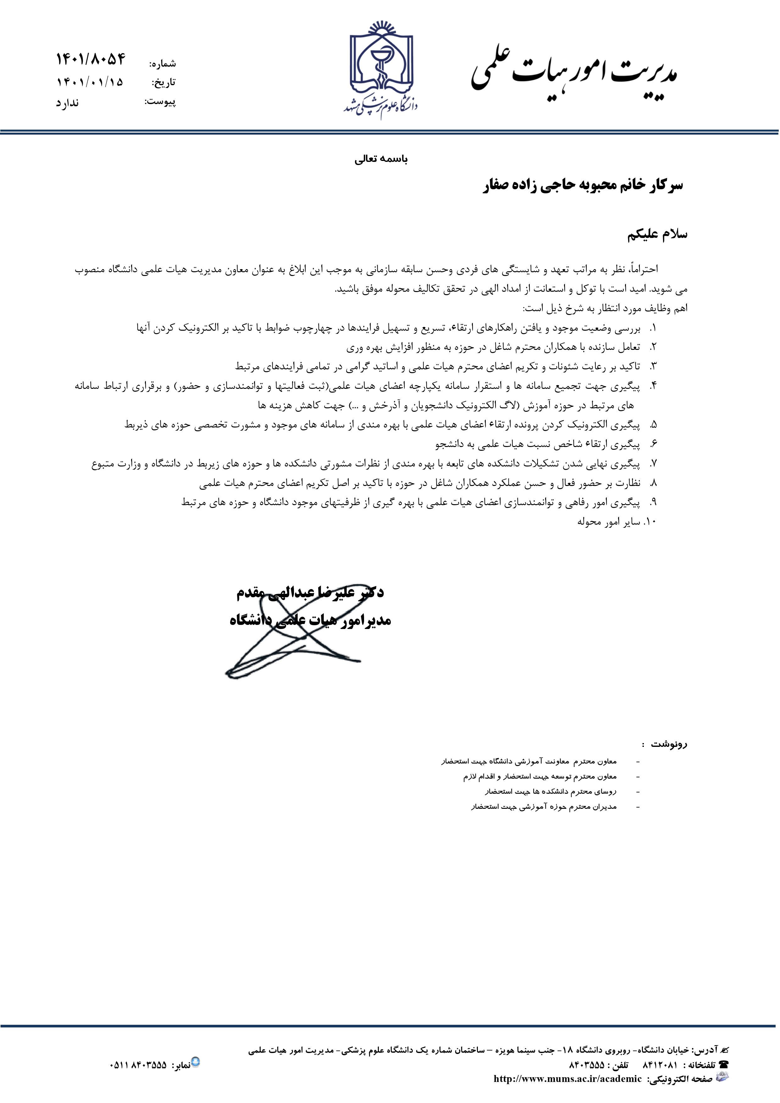در حکم دکتر علیرضا عبداللهی مقدم خطاب به خانم حاجی زاده با برشمردن 10 عنوان وظایف و انتظارات آمده است: