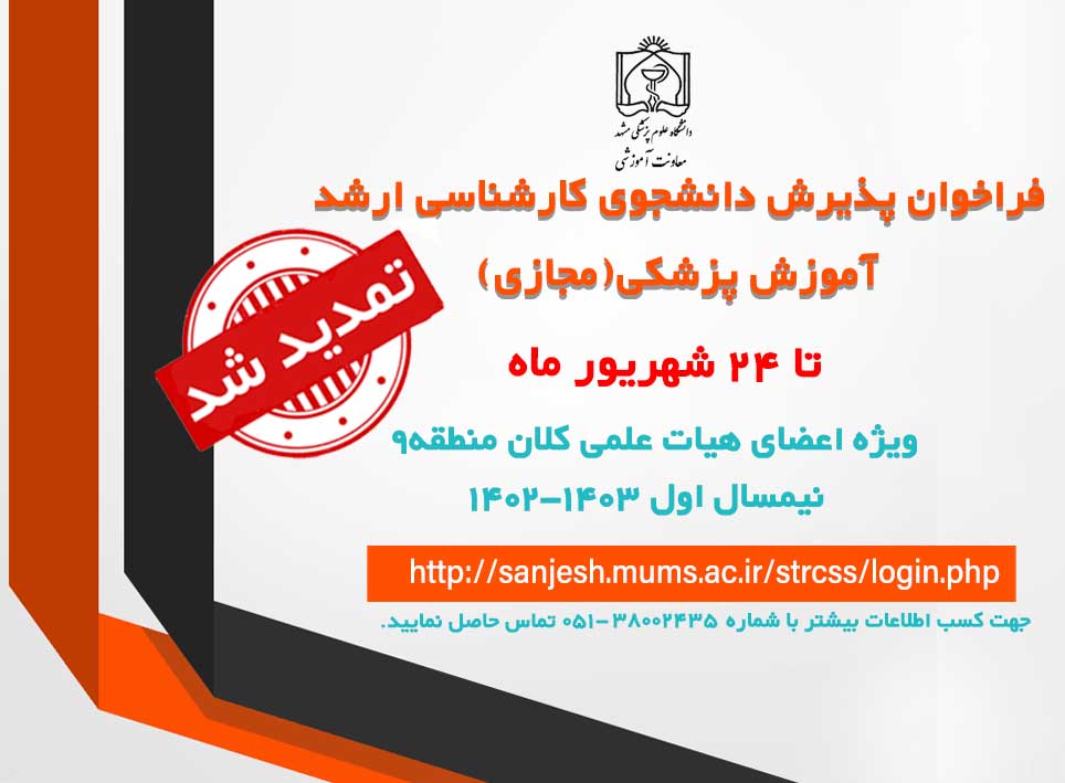 گروه آموزش پزشکی دانشگاه علوم پزشکی مشهد، در نیمسال اول تحصیلی 1403-1402 در مقطع کارشناسی ارشد مجازی رشته آموزش پزشکی از میان اعضای هیأت علمی علاقه مند کلان منطقه 9 دانشجو می پذیرد.