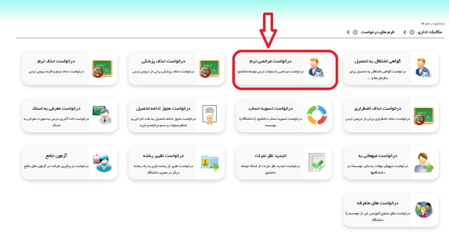 5. سپس گزینه فرم های درخواست ( تصویر سمت راست ) و در ادامه درخواست مرخصی ترم ( تصویر پائین ) را انتخاب نمائید