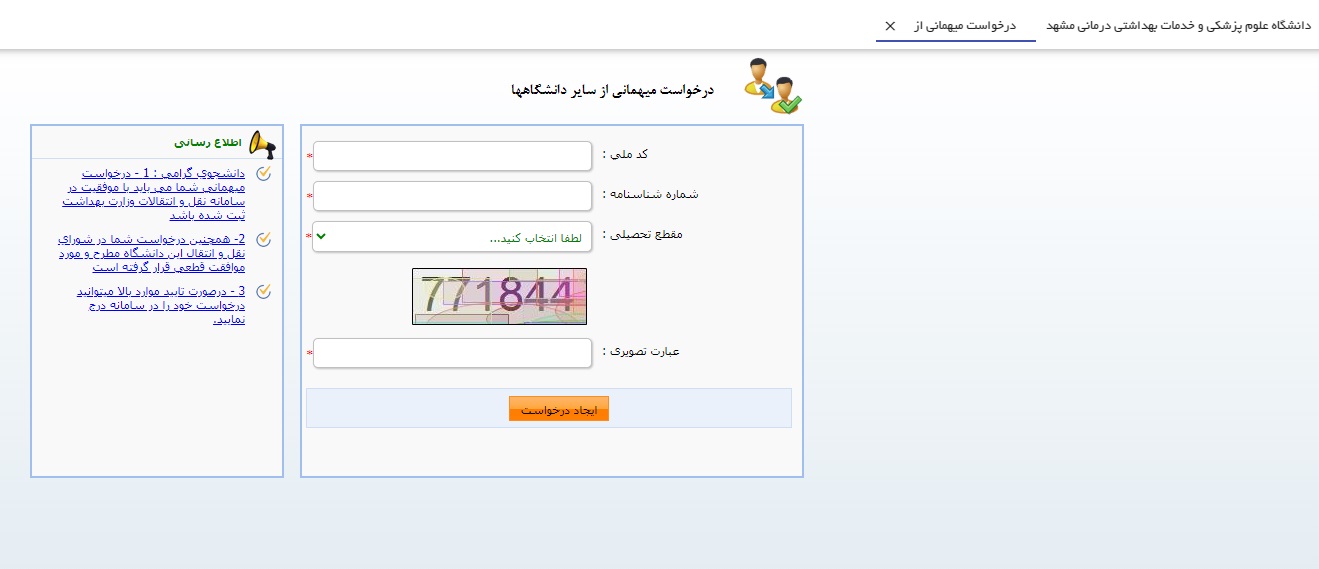 لطفا در صورت اطمینان از موافقت قطعی دانشگاه محل تحصیل خود و دانشگاه علوم پزشکی مشهد ،مانند نمونه وارد سامانه سیپاد شوید