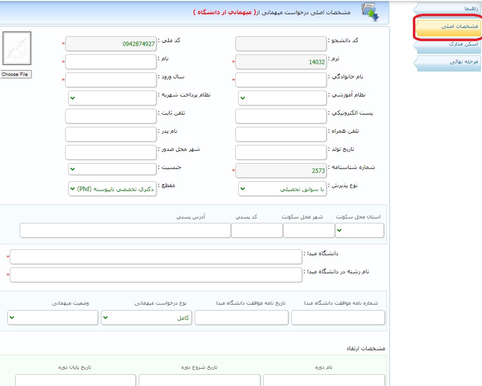 پس از ورود به سامانه درخواست میهمانی فرم مشخصات اصلی- را با دقت کامل نمایید و سپس در قسمت اسکن مدارک- مجوز میهمانی دانشگاه محل تحصیل خود را به همراه سایر مدارک لازم، بارگزاری نموده. در انتهای میبایستی درمرحله نهایی- دکمه ارسال جهت بررسی را انتخاب نمایید.