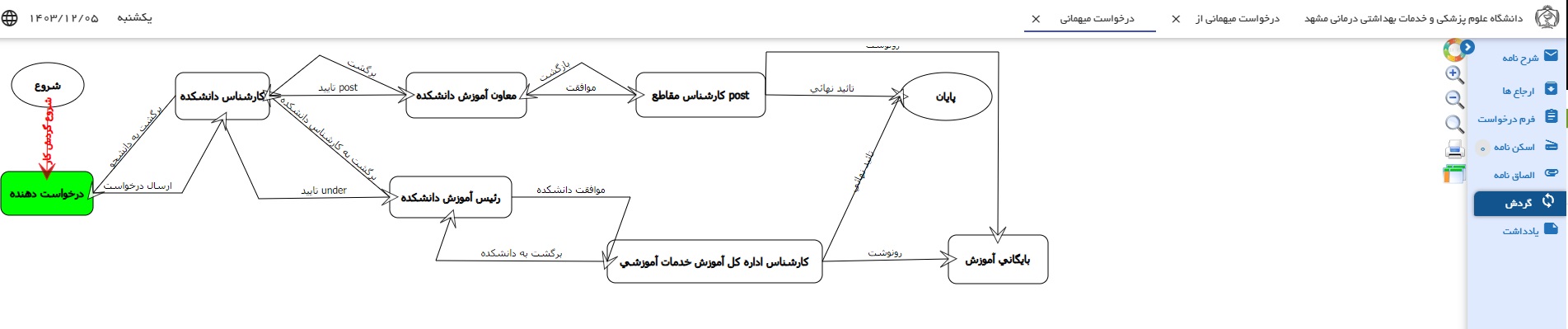 بعد از ارسال نهایی ، شروع درخواست دانشجو طبق گردش کار به کارشناس دانشکده ، معاون و رییس دانشکده برای تایید درخواست ارسال می شود و در آخر به کارشناس آموزشی مدیریت امور آموزشی دانشگاه برای تشکیل پرونده و .. ارسال می شود