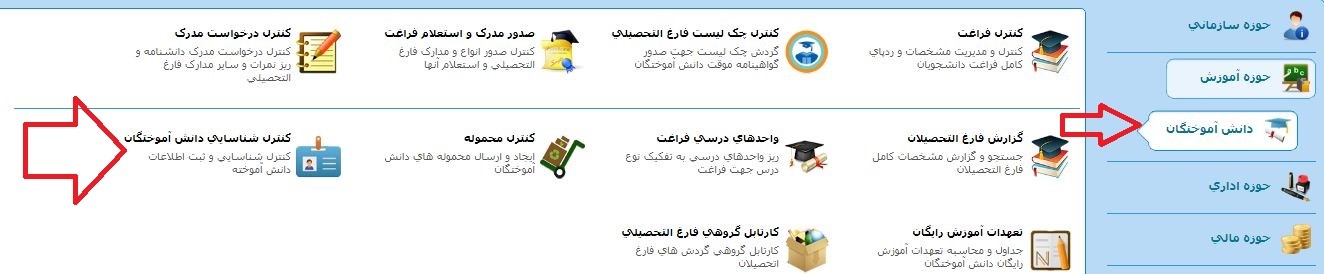 هر شخصی که در گردش دخالت دارد باید حتما از قسمت دسترسی ها دسترسی منوی کنترل شناسایی دانش آموختگان را با این شخص دسترسی دهید.