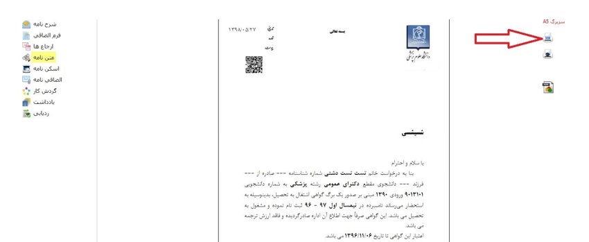 دقت کنید گردش حتما باید به تائید نهایی برسد تا بتوانید متن نامه را دریافت کنید.