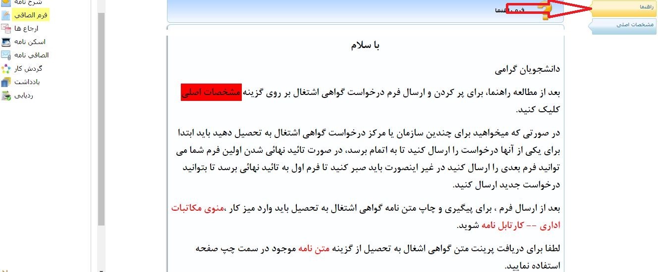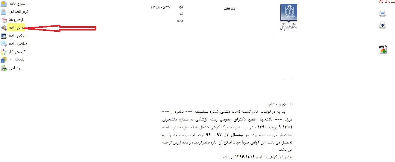 بعد از اینکه این گردش به تائید نهایی رسید ، برای نمایش متن نامه درخواست فرم گواهی اشتغال به تحصیل طبق مسیر بالا بر روی گزینه متن نامه کلیک کنید.