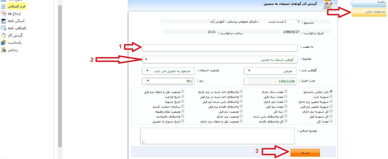 تاکید می شود بعد از ارسال درخواست، برای پیگیری درخواست دیگر بر روی منوی گواهی اشتغال به تحصیل کلیک نکنید چون رکورد شروع گردش جدیدی برای شما ایجاد خواهد شد و تنها درصورتی که فرم قبلی شما تایید نهایی شد و میخواهید برای یک مقصد دیگر درخواست گواهی اشتغال بدهید وارد این منو شوید.