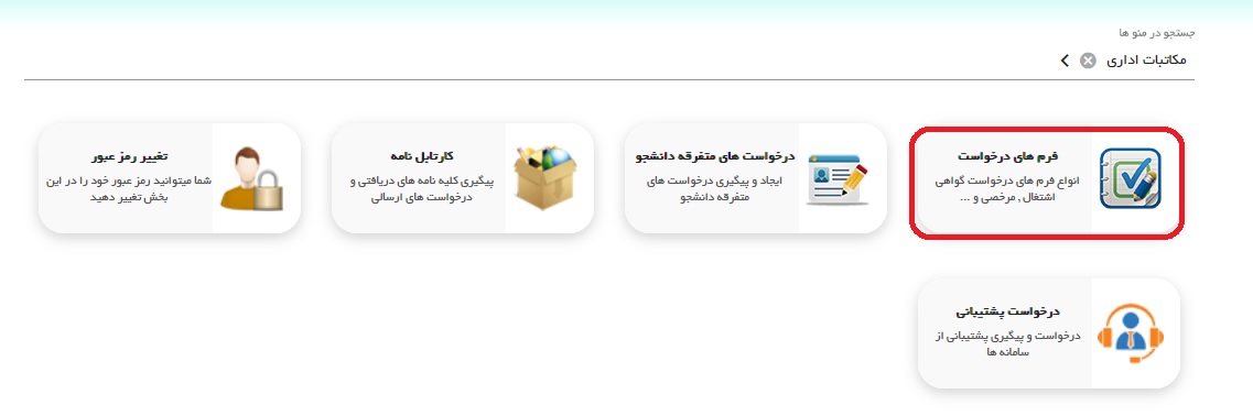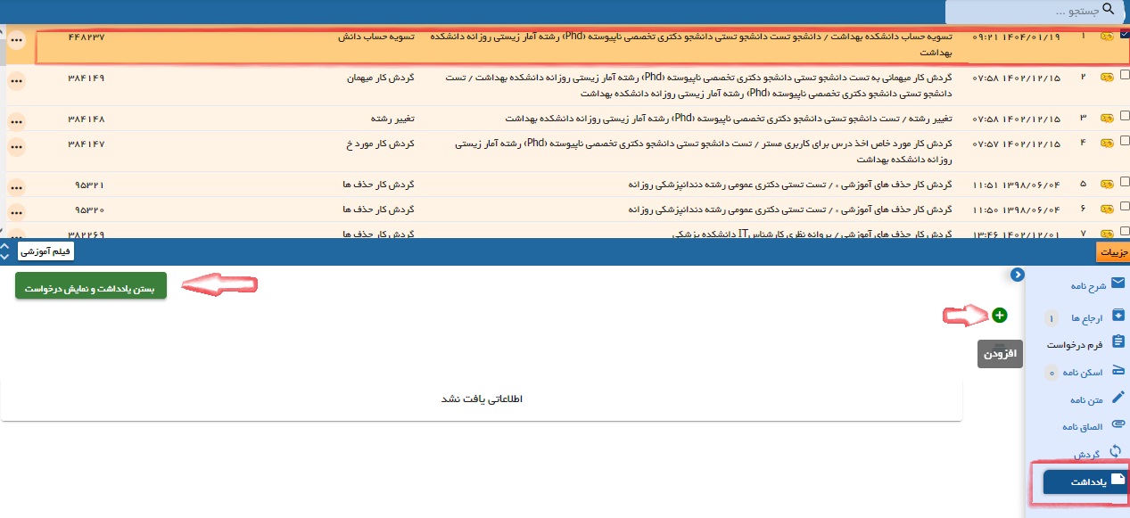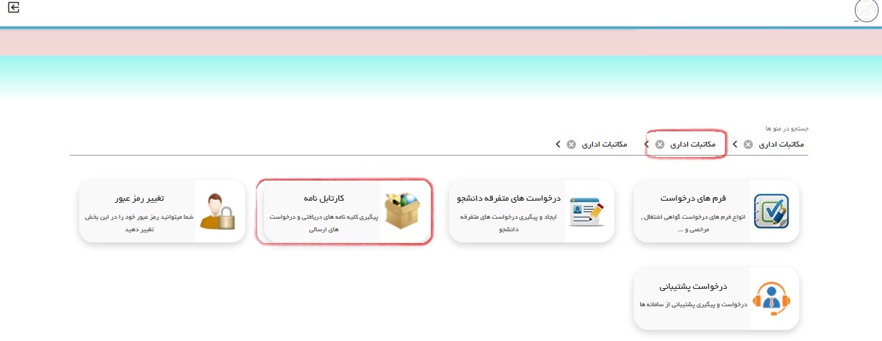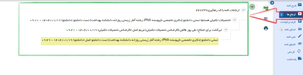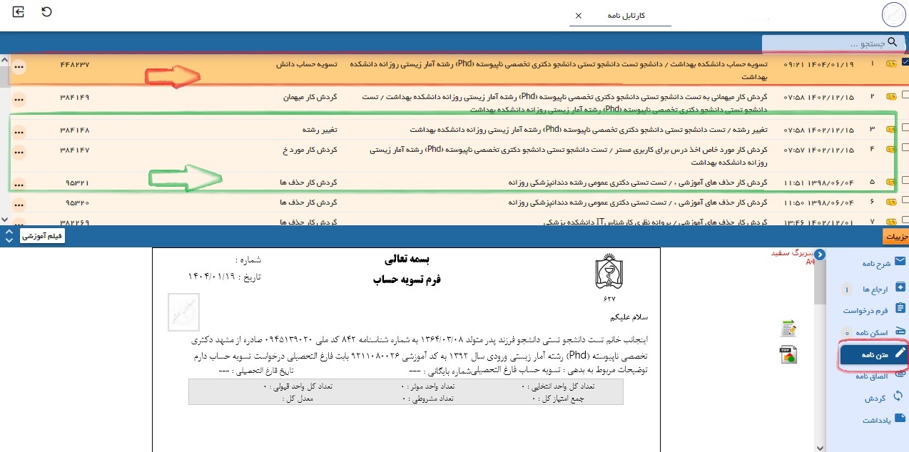 کادر قرمز در کارتابل نامه آخرین درخواست دانشجو و کادر سبز درخواست های قبلی دانشجو می باشد.