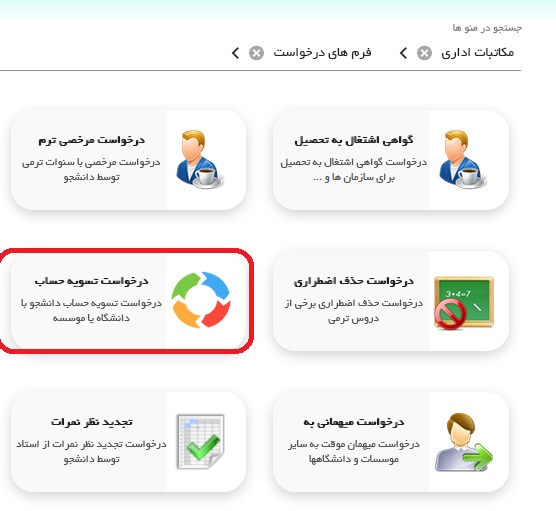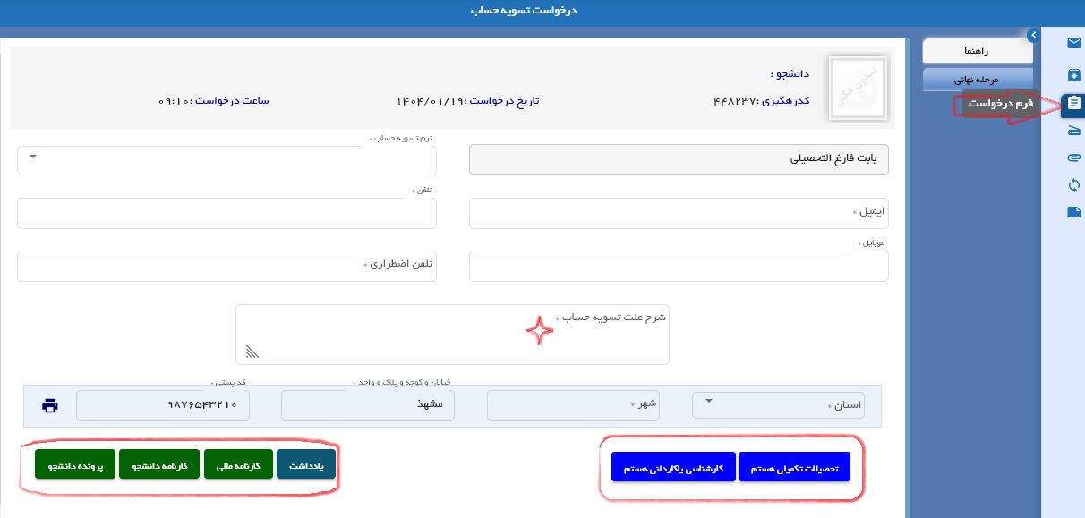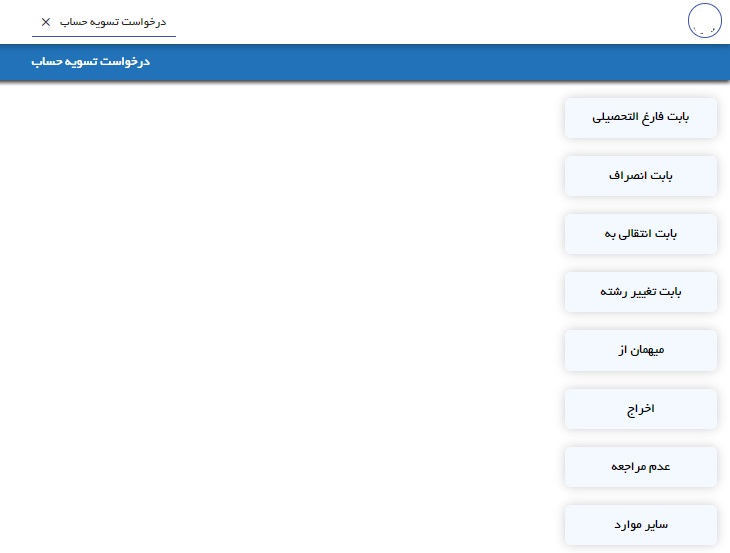 بعد از ورود به صفحه درخواستی، آیکن فرم درخواست را انتخاب و تمامی اطلاعات و شرح علت علت تسویه حساب را وارد و برای ارجاع به کارشناس مربوطه ، نوع مقطع تحصیلی خود را انتخاب و تایید نمایید.