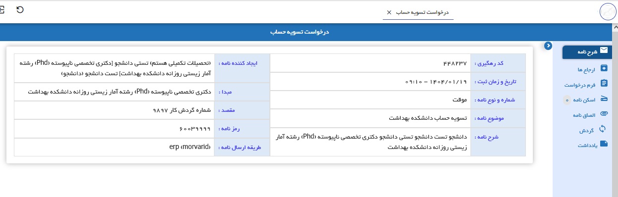 *متن نامه : فرم تسویه حساب است که بعد از ارجاع و تایید تمامی گردش کار قابل مشاهده است