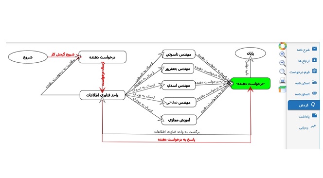 -جهت پیگیری درخواست های خود از منوی 'درخواست های قبلی' و از پنل سمت راست فرم درخواست، "گردش کار" و "ردیابی" آن مشخص است.