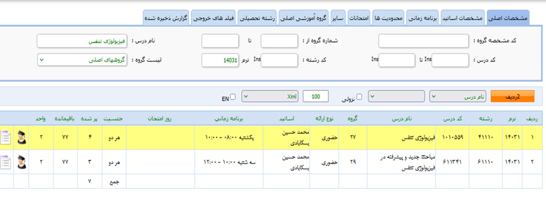 5. در فیلد مشخصات اصلی با در اختیار داشتن و درج کد دروس و یا نام دقیق دروس گروه خود در قسمت های مشخص شده در تصویر بالا و سپس انتخاب جستجو میتوان به ویرایش آن دروس دسترسی داشت