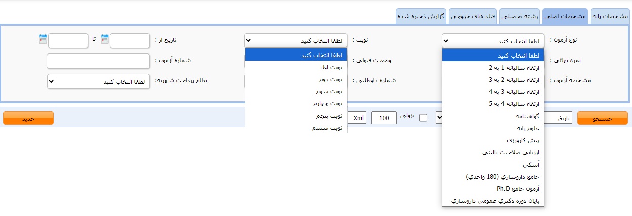 در مشخصات اصلی می توان گزارش را بر اساس نوع آزمون ، نوبت آزمون، رشته تحصیلی و... جستجو کرد.