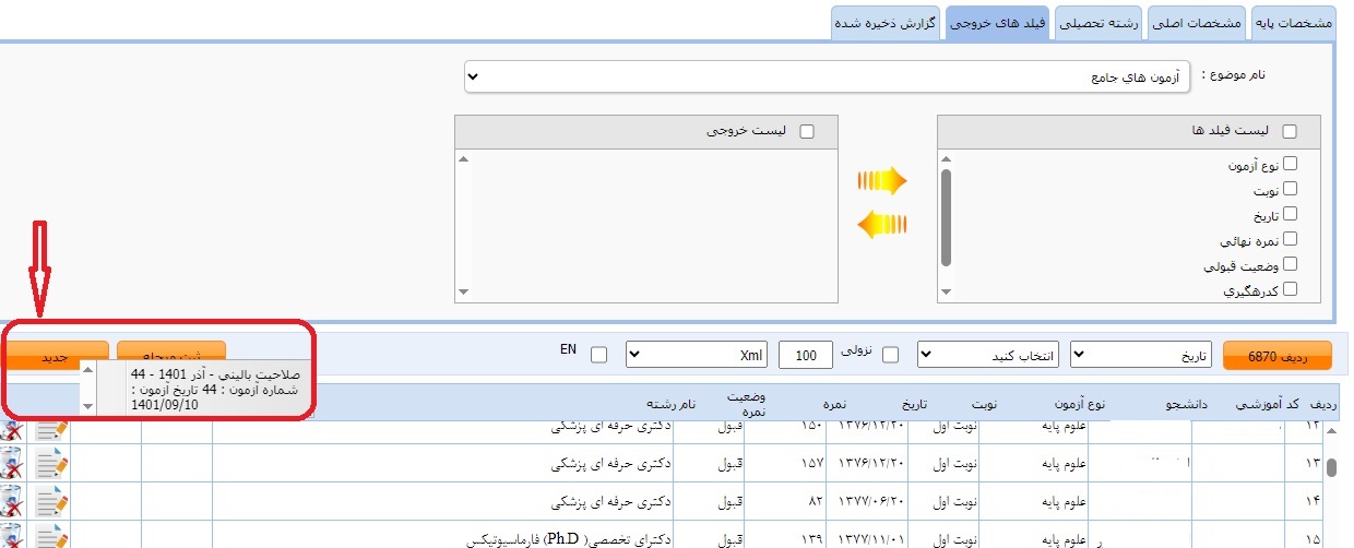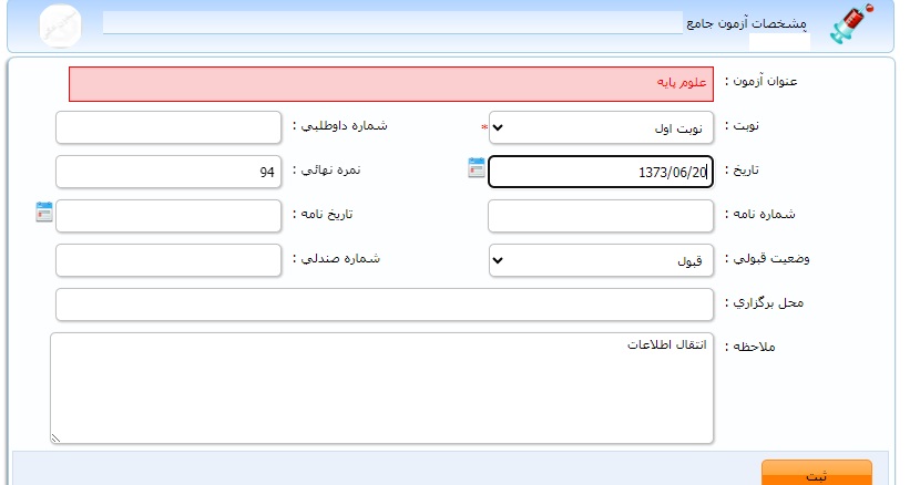 ***همچنین در آیکن جدید هم می توان آزمون فعال را انتخاب و برای دانشجو نوبت آزمون، شماره صندلی و نمره نهایی ، محل برگزاری آزمون و... را مشخص کرد.