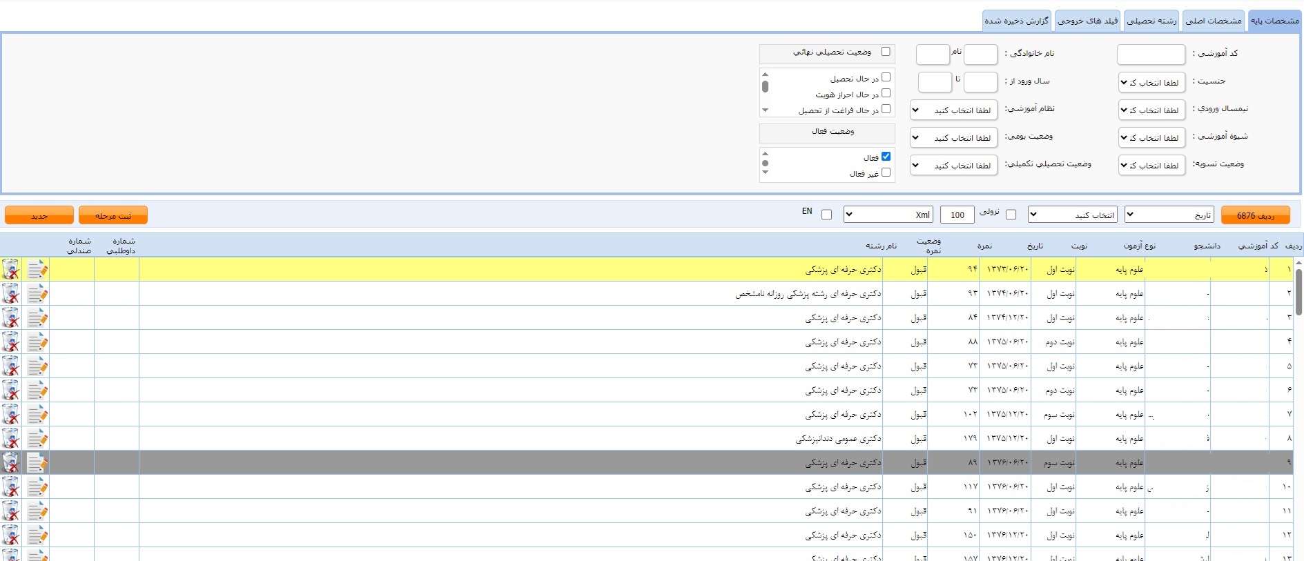 اگر تنها جستجو را کلیک نمایید تمامی دانشجوهای آن دانشکده نمایش داده می شود که با انتخاب آیکن ویرایش می توان مشخصات آزمون دانشجو را مورد بررسی و ثبت قرار داد.