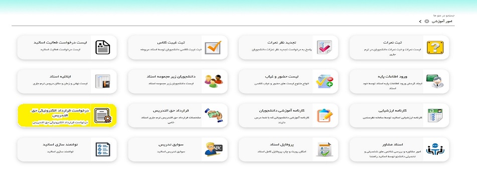 در امور آموزشی ، بر روی آیکون درخواست الکترونیکی حق التدریس کلیک نمایید تا وارد سامانه اساتید شوید